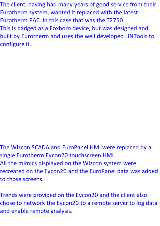 Arun Control Systems was asked to replace an old Eurotherm PC3000 control system, along with its EuroPanel HMI and the Wizcon SCADA station. Case Study - Control, Glass Lamination s Eurotherm PC3000 EuroPanel Eurotherm T2750 with redundant CPU Mounting the Eycon  The Eycon20 was provided mounted in a metal plate to install in the existing enclosure in the space left by the Wizcon screen. integrated control and monitoring systems go to paperless chart recorders go to instrumentation go to instrumentation go to instrumentation go to instrumentation go to instrumentation go to instrumentation go to instrumentation go to instrumentation D_HeaterNotes v1.pdf 8 slave comms limit 1.pdf Glass Lamination go to instrumentation