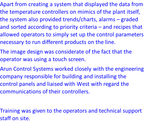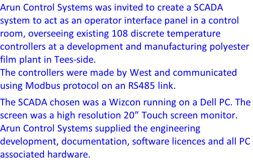 Case Study - SCADA; Plastic Film Line s The instruments were housed in four enclosures, distributed about the plant (enclosure 1 = 21 instruments, enclosure 2 = 30, enclosure 3 = 30 & enclosure 4 = 27) and were linked by RS485 cables directly to a 4 port card installed in the PC. integrated control and monitoring systems go to paperless chart recorders go to instrumentation go to instrumentation go to instrumentation go to instrumentation go to instrumentation go to instrumentation go to instrumentation go to instrumentation D_HeaterNotes v1.pdf 8 slave comms limit 1.pdf Glass Lamination go to instrumentation