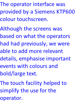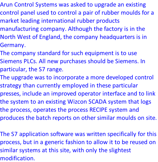 The Siemens S7 PAC and KTP600 operator panel were configured using the Siemens programming tool TIA Portal. Case Study - Control, Rubber Cure s The S7 required a comms module to be fitted to allow a connection to the existing Modbus RTU comms network. The Siemens S7 based system replaced two AB PLC500 PLCs.  The sophisticated control strategy was developed based on the Eurotherm PC3000 systems that Arun Control Systems had been developing on this site for a number of years. integrated control and monitoring systems go to paperless chart recorders go to instrumentation go to instrumentation go to instrumentation go to instrumentation go to instrumentation go to instrumentation go to instrumentation go to instrumentation D_HeaterNotes v1.pdf 8 slave comms limit 1.pdf Glass Lamination go to instrumentation